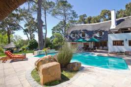 Plotsklaps offers self catering cottage accommodation in Tokai, Cape Town. A superb family home situated on the slopes of Constantiaberg Mountains bordering Tokai Forests, wine producing vineyards and magnificent golf courses, and mountain walks. Relax under the African skies on an acre of rolling lawns, parkland flower borders, a sparkling pool and patio, sauna, cool and shady lapa with mountain views to enjoy for a lazy afternoon. Meanwhile let the children enjoy the jungle gym, tree swing, and refreshing pool, before retiring to a night under the romantic thatch roof. On arrival you will be welcomed by the warmth of Africa throughout the calm and peaceful home, tucked away from the hustle and bustle of urban life which is reached within 5 minutes of driving. Plotsklaps offers home from home comfort for family living, providing all your conveniences to make life easy and simple for your stay in Tokai. The self catering accommodation is laid out over 2 levels, comprising of, 2 bedrooms, both en-suite, a fully fitted and equipped kitchen, dining room and television lounge. Tokai is situated in Constantia Valley, nestled under the Constantiaberg Mountains and easily accessed via the M41 and M42, this area's special feature is its Forest reserve. Tokai is named after wine-producing hills in Hungary. The Forest reserve was the first in South Africa to implement a reforestation plan, out into effect in 1883. due to this, large parts of the Constantiaberg Mountains are covered in pine trees. Mountain biking, walking and mushroom-picking are all activities that attract nature lovers and can be enjoyed in the Tokai Forest. The Tokai Forest Arboretum, established in 1885, is a national monument and has a variety of trees including large Californian Redwoods and Oaks.
